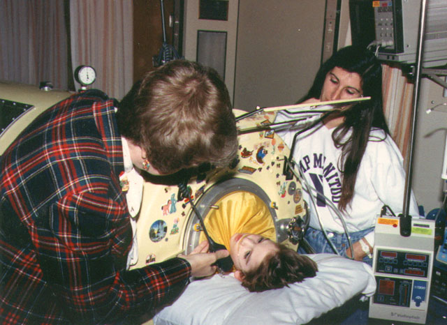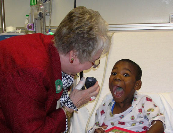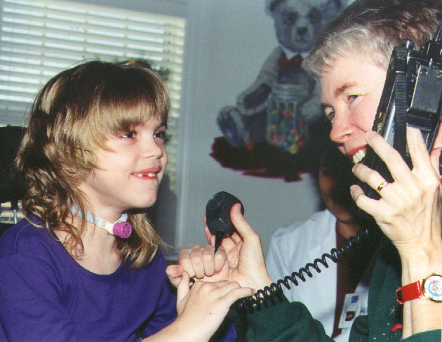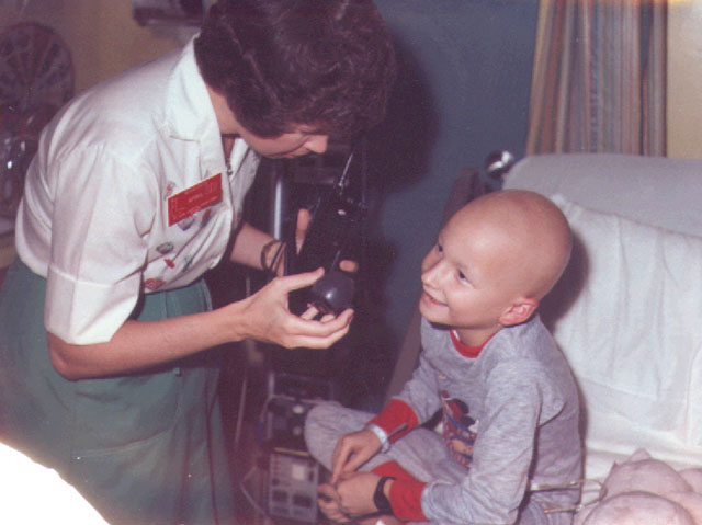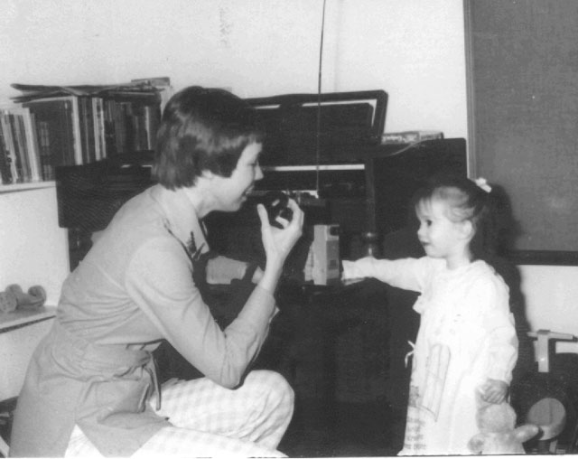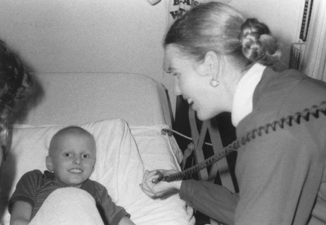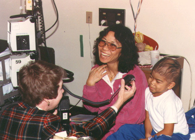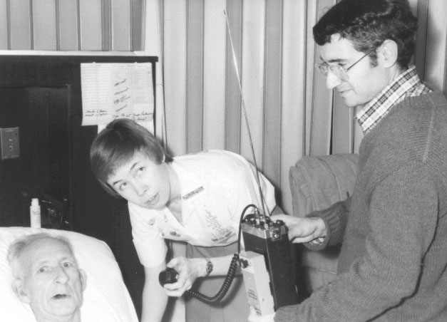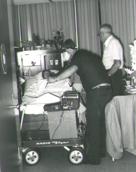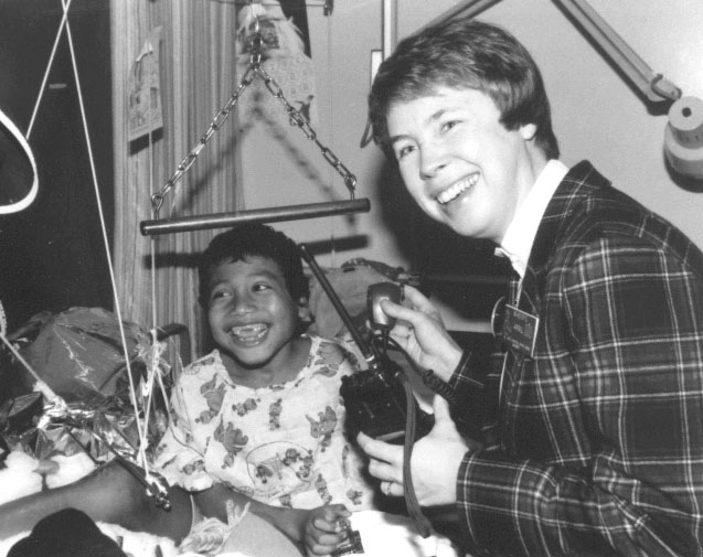 Karen Gallant WB6DCB held the radio for April as they visited this St. Jude pediatric patient in 1978.