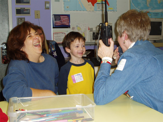 Our first North Pole Network activities took place in 1976 at St Jude Hospital and Rehabilition Center (as it was then named) in Fullerton, California, where April Moell WA6OPS was the Director of Occupational and Recreational Therapy. Members of the Southern California ATV club brought ham television equipment into the hospital so that patients could see Santa as they talked to him. Getting good pictures on 434 MHz throughout the hospital was not easy, and the audio was also a problem because we were using a wide-coverage repeater with frequent malicious disruptions. In this photo, April introduces a Rehabilitation unit patient to Santa as the patient's husband watches and an ATV club member adjusts the TV gear.