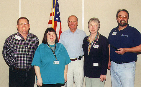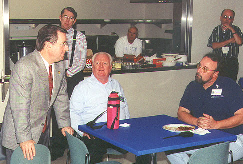 U. S. Congressman Ed Royce addressed the 2002 workshop group one year at lunchtime. In this photo, Congressman Royce (left) chats with HDSCS members (left to right) Paul Broden K6MHD, Richard Thompson WA6NOL, Ray Rittenhouse KF6WZN, Dennis Kidder W6DQ, and David Mofford W7KTS.